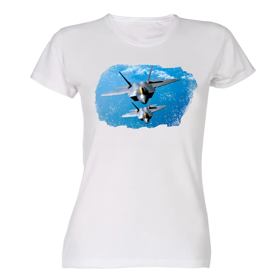 تیشرتی که میبینید، جزء فرم های خاص ارائه شده در مجموعه ایلاکپتن می‌باشد. گرافیک استفاده شده در این طرح روی تیشرت سفید به صورت دقیق چاپ شده است که زیبایی و تمیزی کار را چند برابر می کند. در این تیشرت از عکس پرواز واقعی دو جنگنده آمریکایی اف 22 رپتور یا F22 Raptor استفاده شده است. گفته می‌شود این هواپیما از لحاظ قدرت مخفی کاری و عدم شناسایی رتبه اول را دارد و موقع پرواز قابل شناسایی و رهگیری راداری نیست. رنگ های استفاده شده نیز طوسی و آبی می‌باشد. برای مشاهده طرح های دیگر وارد صفحه انواع تیشرت های زنانه شوید.